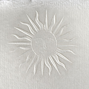 Confezione da 5 biglietti 13x8 e 5 buste 14x9. Ogni biglietto ha impresso a rilievo un sole, realizzato con la tecnica della pressatura a secco.