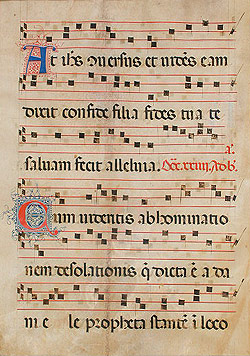Manoscritti su pergamena, fogli di un antifonario decorati rossi e blu ad ispirazione bizantina. Epoca 1411. Provenienza toscana. Pergamena cm. 30x41. Manoscritti sia davanti che al verso. Sono montati in un passepartout avorio con fascia decorata oro oppure bordeaux. Le foto sono indicative. Ogni pergamena presenta due o tre capolettera miniati.