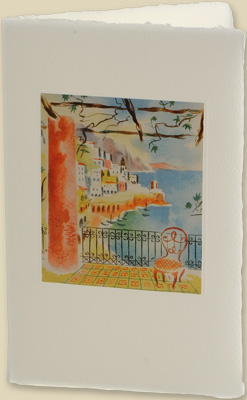 Scatola da 5 cartoncini doppi e 5 buste 12x18. La stampa eseguita in litografia su una particolare carta patinata adesiva applicata sul cartoncino. Il dipinto riprende la copertina del menù proposto a pranzo sulla nave Andrea Doria negli anni 1950 circa.