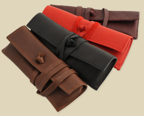 Portamatite in pelle. E' un comodo astuccio che si chiude con il laccio in morbida pelle, proposto in vari colori a scelta.