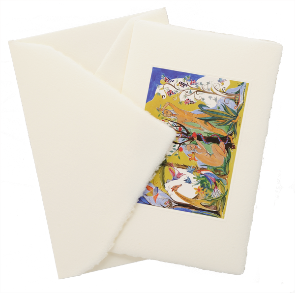 Cartoncino doppio e busta in carta fatta a mano di Amalfi. La stampa eseguita in litografia su una particolare carta patinata adesiva applicata sul cartoncino. Disegni tratti da lavori originali dell'artista Clara Garesio.