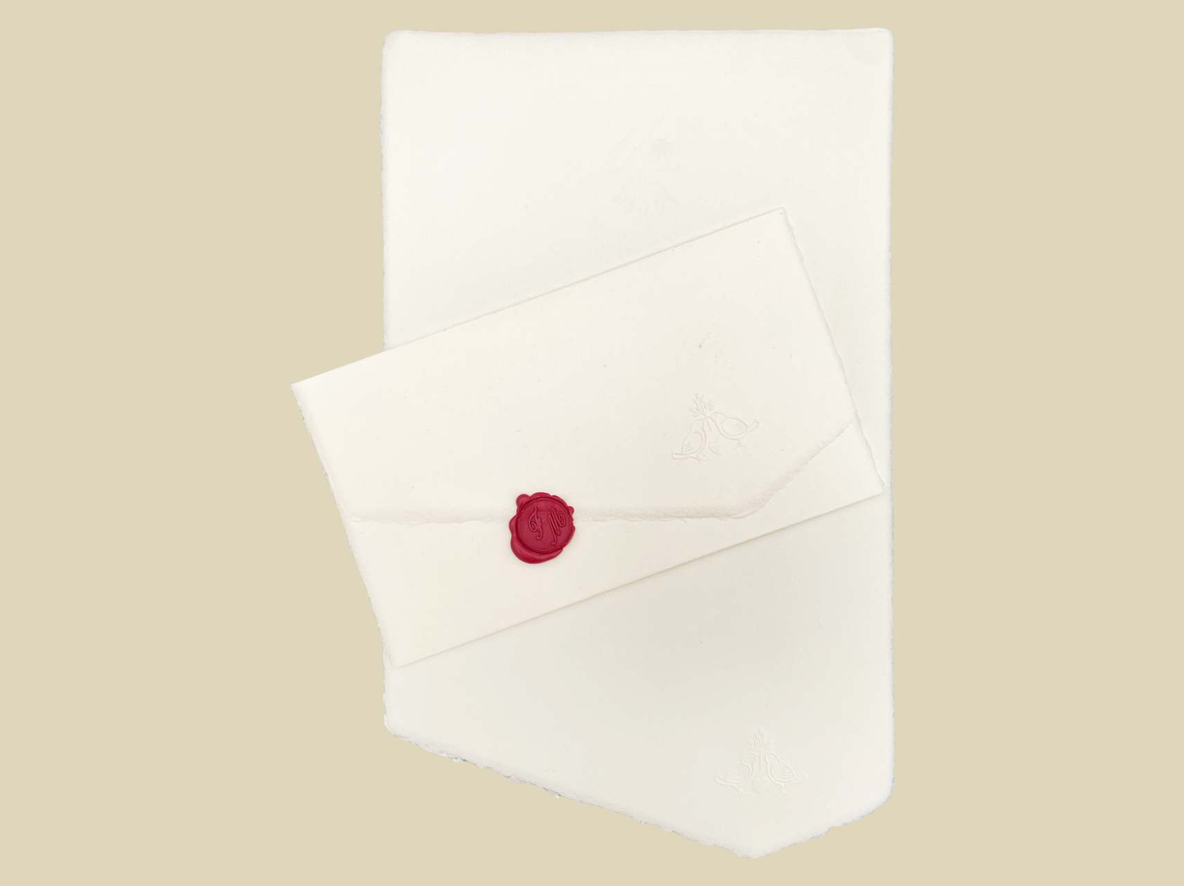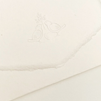 Partecipazione stampa a secco in carta di Amalfi con due colombe, simbolo dell'amore che dura tutta la vita. Si chiude in tre parti. Disponibile in avorio misura cm. 18,5x30 aperta e chiusa circa cm. 18,5x11 gr. 200 circa. La stampa viene eseguita da una bottega artigiana con la tecnica dell'incisione a bulino. Può essere spedita normalmente a mezzo posta. La filigrana presenta lo stemma di Amalfi. Necessita del sigillo in ceralacca per la chiusura. Si presta per essere scritta a mano, stampata in tipografia o con stampanti a getto di inchiostro.